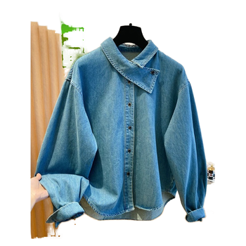 2025 Early Spring Mulheres Denim Camisa Assimétrica Collar Oversized Azul Denim Blusa Chique Mulheres Top